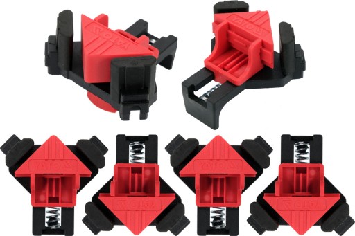 Zestaw czterech silnych sprężynowych ścisków kątowych, przeznaczonych do zaciskania łączonych elementów pod kątem 90 stopni.
