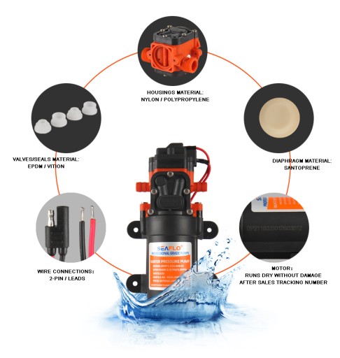 Wyposażona w trwałą membranę i precyzyjne zawory oraz w silnik zabezpieczony przed przegrzaniem, co dopuszcza czasową pracę na sucho bez uszkodzeń mechanizmu. Łatwa w instalacji, serwisowaniu i zimowaniu. Znajduje zastosowanie w układach instalacji wodnej na jachtach, w przyczepach kempingowych, w nawadnianiu, w solarnych systemach wodnych oraz w przemyśle.