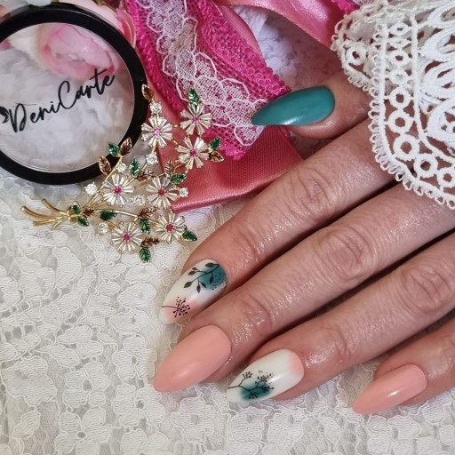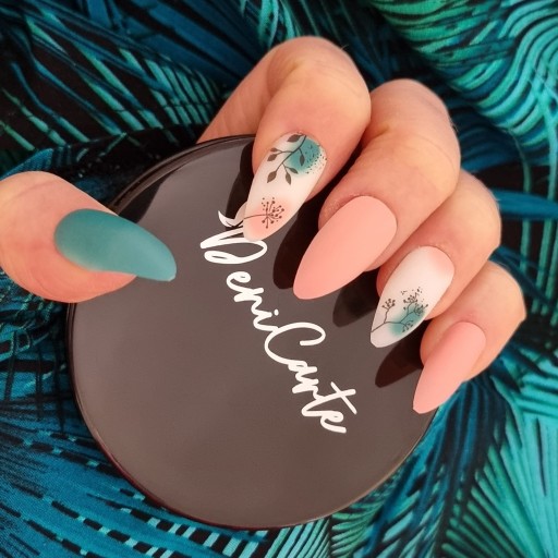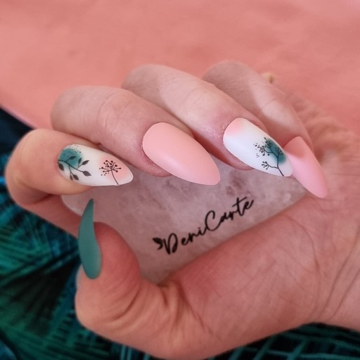 ✔️Wybrany model jest w pięknych matowych odcieniach moreli, zieleni oraz bieli z ozdobnymi czarnymi elementami. Paznokcie w kształcie migdała.