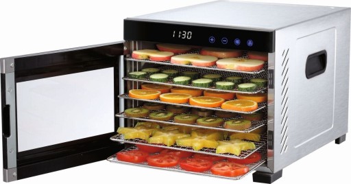 Suszarka wyposażona jest w 6 kratek (trwałych, bezpiecznych dla żywności, higienicznych, łatwych do utrzymania czystości, które można również myć w zmywarce do naczyń) ze stali nierdzewnej (każda o wymiarach 33 x 30,5 cm) do suszenia każdego rodzaju żywności