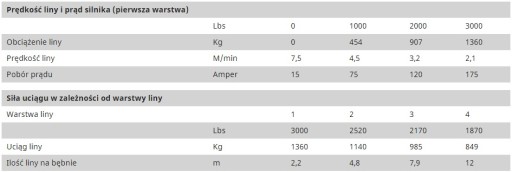 - Siła uciągu (lina pojedyncza): 3000 lbs / 1361 kg