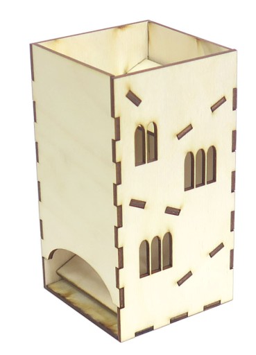 Wieża do kości ze sklejki o grubości 3mm o zewnętrznych wymiarach: wysokość: 150mm, szerokość: 80mm, głębokość: 80mm