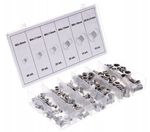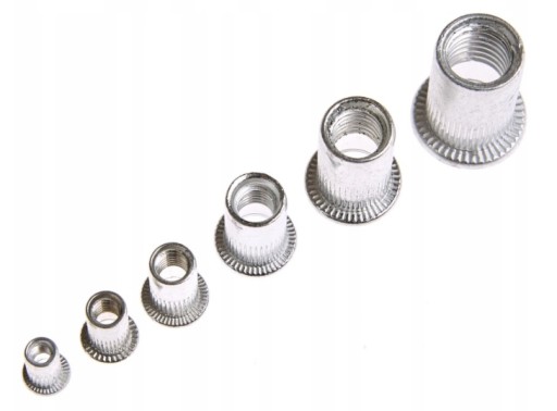 Zestaw aluminiowych nitonakrętek M3-M10 . Kołnierz walcowy, radełkowany, dzięki czemu ściślej przylega do mocowanego elementu. Nitonakrętki umożliwiają wkręcenie wkręta bądź śruby z gwintem metrycznym w blachę lub inne materiały, tam gdzie nie ma możliwości wykonania gwintu.