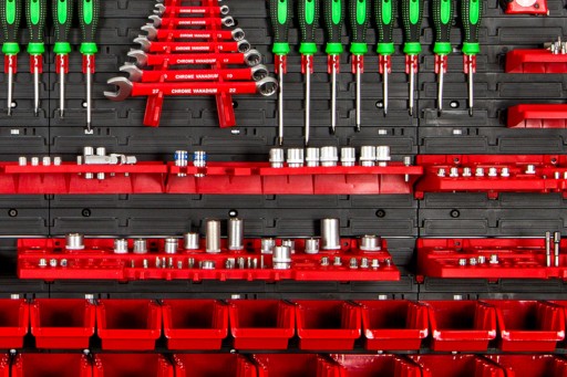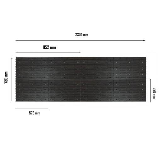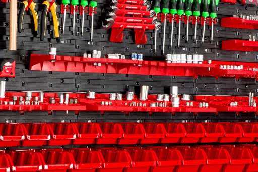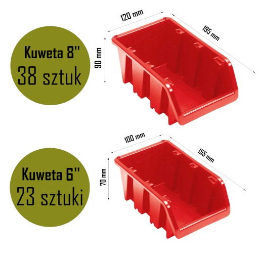- W zestawie 61 sztuk kuwet, zestaw uchwytów do narzędzi (w sumie 40 sztuk), 10 półek oraz 8 tablic ściennych 576 mm x 390 mm (po złączeniu 230 cm x 78 cm)