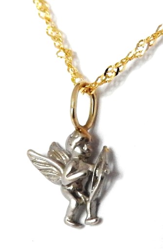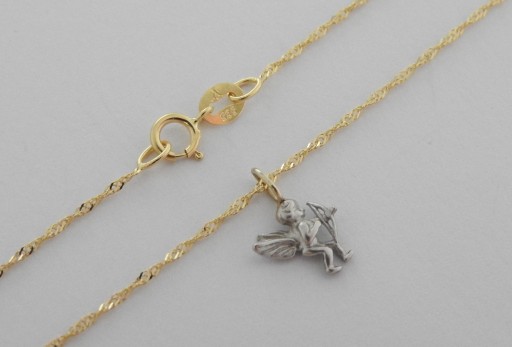 Amorek z łańcuszkiem (singapur). Komplet wykonany jest z białego oraz żółtego złota w próbie 585.
