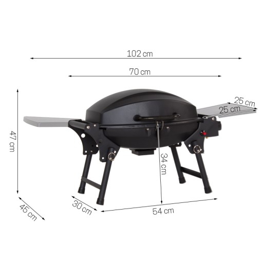 Grill posiada rozkładane półki boczne, które stanowią dodatkową powierzchnię roboczą, podczas przygotowywania potraw. Składane nogi i półki, oraz pokrywa zamykana na zatrzask sprawiają, że grill zajmuje mało miejsca i jest łatwy w transporcie.