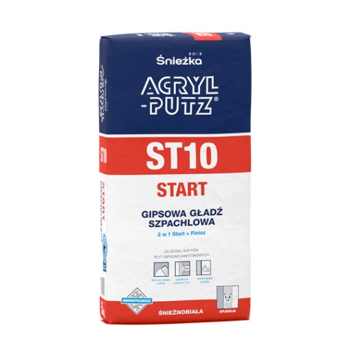 ACRYL-PUTZ® ST10 START jest sypką gładzią szpachlową na bazie gipsu naturalnego, wypełniaczy mineralnych i środków modyfikujących doskonale przyczepną do podłoży. Nie wykazuje skurczu, wysycha w krótkim czasie, nie pęka nawet w grubych warstwach (do 3cm przy pojedynczych ubytkach) i łatwo się szlifuje. Zarobioną gładź można nakładać "mokro na mokro" tj kolejną warstwę przed pełnym wyschnięciem poprzedniej co znacznie skraca czas pracy. Ściany i sufity po zastosowaniu gładzi szpachlowej uzyskują idealnie gładką, śnieżnobiałą, łatwą do malowania powierzchnię.