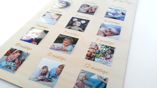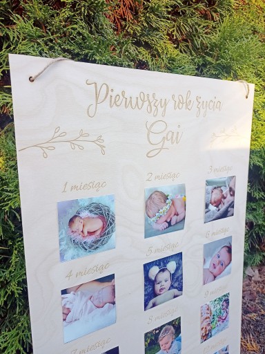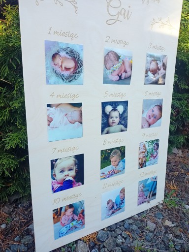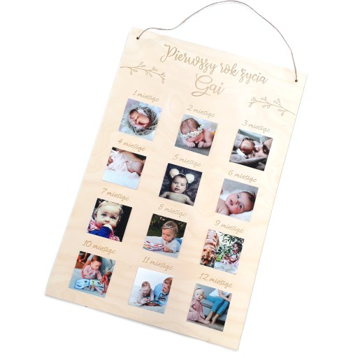 Drewniana Tablica z ramki na zdjęcia. Wspaniała pamiątka z pierwszego roku życia dziecka.