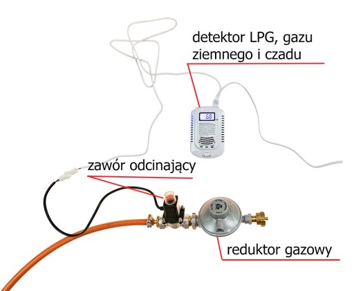 Detektor po wyczuciu gazu LPG, ziemnego i czadu uruchamia zawór, który odcina dopływ gazu.