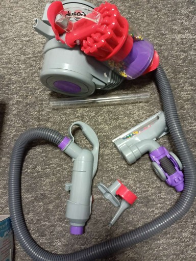 Odkurzacz Dyson działa jak prawdziwy odkurzacz, a po włączeniu wydaje dźwięki. Posiada zbiornik z wirującymi kolorowymi kuleczkami. Odkurzacz wciąga niewielkie, lżejsze śmieci do środka. Jest to odkurzacz-zabawka i jego siła ssąca jest dużo mniejsza , niż prawdziwego odkurzacza. Zabawka idealnie sprawdzi się jako narzędzie do zabawy w dom i zaangażuje dziecko w sprzątanie. Odkurzacz posiada pojemniczek na śmieci, który można samemu opróżniać. Po włączeniu zabawki dziecko może obserwować cyklonową akcję.