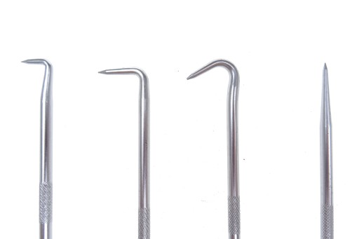 Opis produktu: Praktyczny zestaw różnie wygiętych stalowych grotów (3 szt.) oraz jeden grot prosty do zdejmowania plomb, oringów, do czyszczenia, przekłuwania itp.