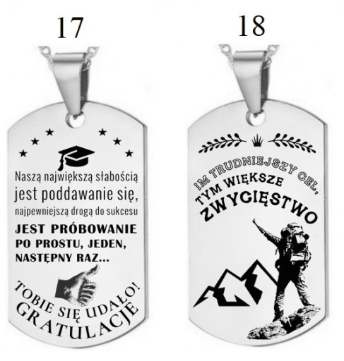 UWAGA: Projekt przedstawiony na głównym zdjęciu jest dwustronny, jak widać na zamieszczonym na aukcji zdjęciu. Jest to projekt numer 33 z podanych poniżej. Pozostałe projekty są jednostronne ale w cenie możemy wygrawerować dowolny tekst na odwrocie nieśmiertelnika.