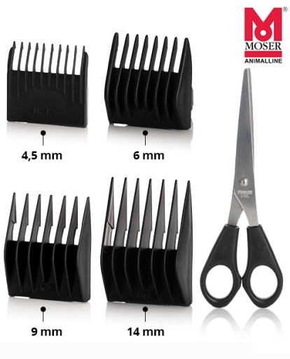 Moser 1400 Animaline z 4 nasadkami: 4,5 mm, 6 mm, 9 mm, 14 mm + oryginalne nożyczki Moser