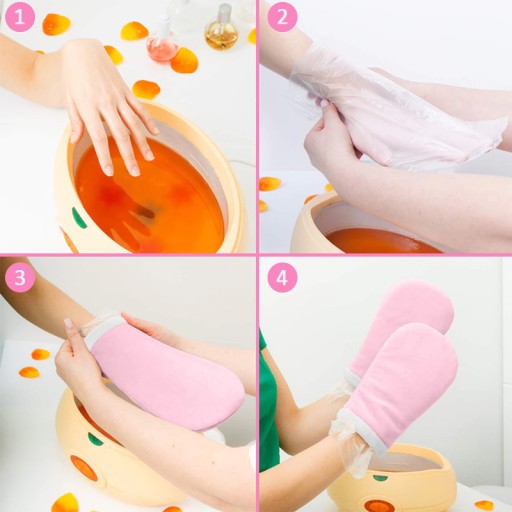 Rękawiczki i skarpetki wykonane z miękkiego materiału typu frotte niezbędne podczas wykonywania zabiegów parafinowych i odżywczych na ciało.