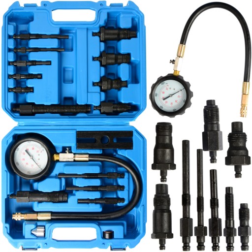 - Zestaw zawiera miernik ciśnienia do 70 BAR (1000 PSI) z przewodem, szybkozłączem i zaworem zwalniającym, 4 adaptery montowane w miejscu wtryskiwacza,