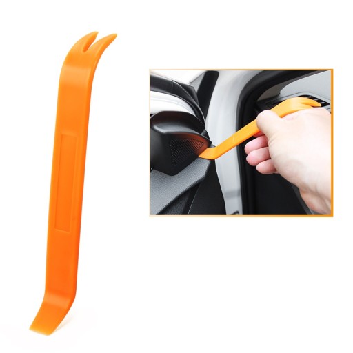 Ściągacz do spinek tapicerki. Długość 200 mm. Ściągacz służy do bezpiecznego rozpinania spinek tapicerskich używanych w łączeniu elementów wnętrza i karoserii samochodowej. Ściągacz uwalnia spinkę o konstrukcji kołka lub kołka rozporowego z otworu, wykorzystując widełkową konstrukcję końcówki roboczej oraz dźwignię ramienia.