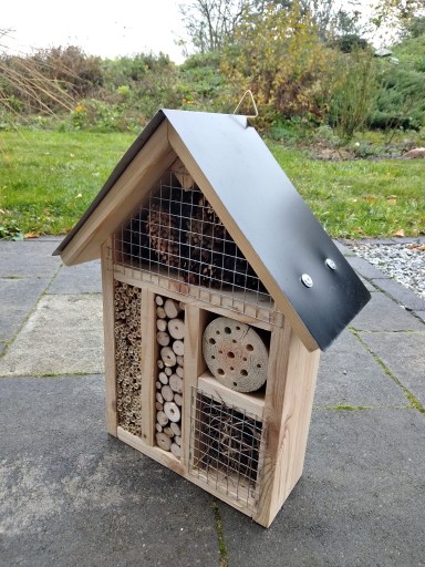 Domek dla biedronek, pszczół murarek ,hotel dla pożytecznych owadów o wymiarach około 40cm x 30cm(z daszkiem)x 9,5cm . Domek oprócz wabienia pożytecznych owadów pszczół pełni również funkcję dekoracyjną. Domki sprzedaje w naturalnej kolorystyce, które można dowolnie malować wedle uznania domek wykonany jest z naturalnych materiałów widocznych na zdjęciach. Domki ze względu na użyte naturalne materiały mogą się nieznacznie różnić od siebie . Domek należy ustawić /zawiesić w osłoniętym od wiatru i deszczu miejscu.