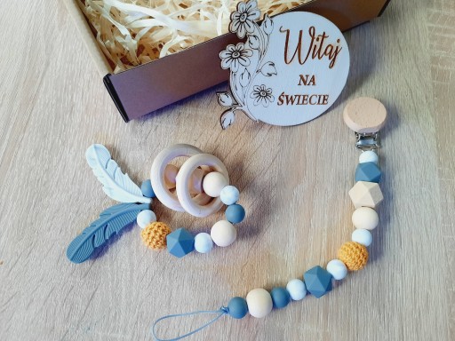 ❤ Zestaw zapakowany na prezent - zawieszka do smoczka i gryzaczek do rączki ❤