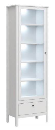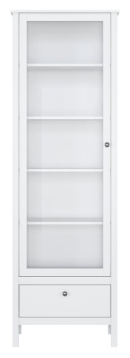 WITRYNA WYSOKA KALMAR 1W1S to wąska propozycja systemu meblowego Kalmar, która łączy wysoki walor estetyczny z funkcjonalnością. Model witryny przeszklonej z pięcioma półkami uzupełnia pojedyncza szuflada. Wyposażona w metalowe uchwyty witryna wysoka na cienkich i minimalistycznych nogach podstawy zapewnia wizualną lekkość. Biały model o matowej powierzchni wykonany został z płyty laminowanej, dzięki czemu zapewnia łatwą w pielęgnacji powierzchnię oraz odporną na działanie czynników mechanicznych. Witryna biała o wymiarach 65 cm szerokości, 201 cm wysokości oraz 37 cm głębokości doskonale odnajdzie się w aranżacjach skandynawskich, angielskich, nowoczesnych i eklektycznych.