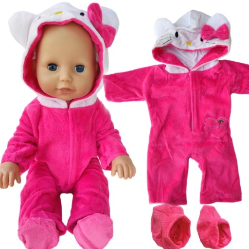 PAJACYK DLA LALKI Z MILUTKIEGO I DELIKATNEGO MATERIAŁU Z KAPTURKIEM ORAZ BUCIKAMI STYLIZACJA HELLO KITTY.