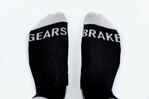 Podczas tworzenia skarpetek przyświecała nam idea rozwiązania odwiecznego problemu. Na prawej skarpetce umieściliśmy napis "brake", a na lewej "gears" ;)