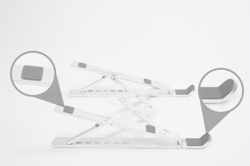 podkładka antypoślizgowa może zamocować komputer przenośny we właściwej pozycji i chronić urządzenie / powierzchnię biurka po umieszczeniu. Stojak na laptopa jest wykonany z lekkiego, wytrzymałego aluminium, co zmniejsza wagę podstawki i zwiększa nośność.