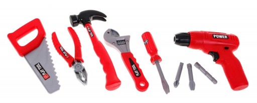 Zestaw zawiera wszystko, co niezbędne małemu majsterkowiczowi, aby mógł piłować, wiercić, wkręcać i stukać młotkiem.