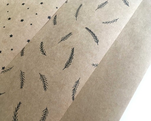 15 arkuszy papieru pakowego KRAFT o gramaturze ok. 90 g wielkość ok. 29,5x41,8 cm - 5 arkuszy wzór gwiazdki, 5 arkuszy gałązki i 5 arkuszy bez wzoru/czysty - - jak na foto