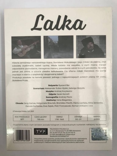 Odcinki: 1. Powrót 2. Pamiętnik starego subiekta 3. Wielkopańskie zabawy 4. Pierwsze ostrzeżenie 5. Widziadło 6. Wiejskie rozrywki 7. Ciąg dalszy pamiętnika starego subiekta 8. Damy i kobiety 9. Dusza w letarguOpis:Historia zamożnego warszawskiego kupca, Stanisława Wokulskiego i jego miłości do pięknej, choć zubożałej arystokratki, Izabeli Łęckiej. Młoda kobieta ma wszystko, o czym można marzyć: odpowiednie pochodzenie, nienaganne maniery, powodzenie wśród licznych adoratorów. Jej serce jednak jest zimne, a uczucia chłodno kalkulowane. Czy ofiarna miłość Stanisława ma szansę zwyciężyć w starciu z oziębłością i obojętnością Izabeli?Produkcja powstała na kanwie powieści jednego z najwybitniejszych polskich pisarzy XIX wieku, Bolesława Prusa.