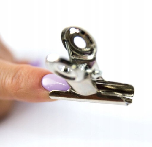 Metalowy klips służący do zaciskania i formowania krzywej C paznokci żelowych i akrylowych na szablonie lub tipsie.