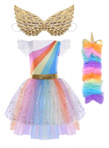 Sukienka wykonana z bawełny, dół z tiulu posypanego brokatem. W pasie gumka. Przedłużony tył sukienki, który daje złudzenie ogona jednorożca. Skrzydła zakładane na gumkę.