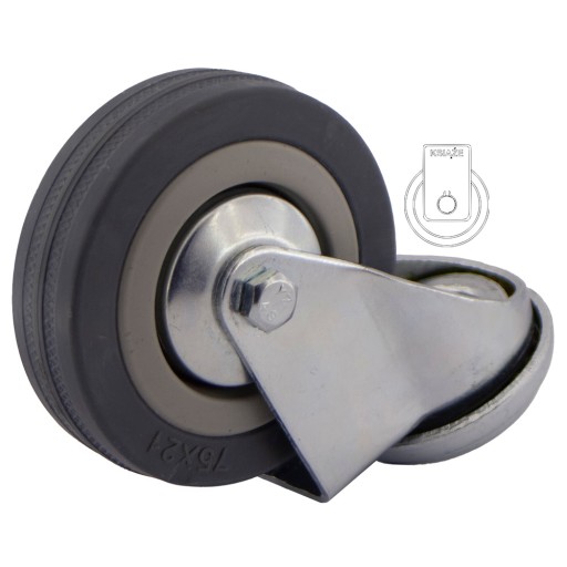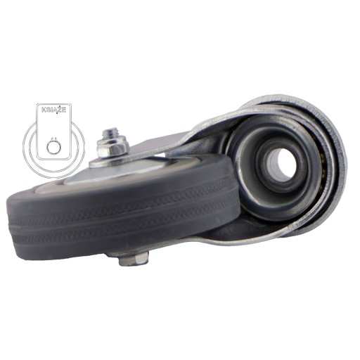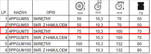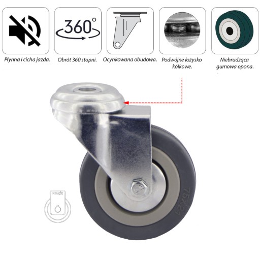 Koło składa się z polipropylenowej piasty oraz z niebrudzącej gumowej opony, posiada łożysko ślizgowe, wersja z osłonką. Mocowanie zestawu na otwór o kodzie 4PPGUM75. W tabeli pod pozycją 3.
