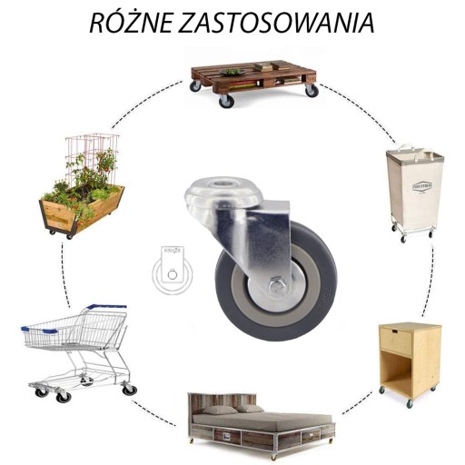 - KOŁO składa się z polipropylenowej piasty oraz z niebrudzącej gumowej opony, posiada łożysko ślizgowe. Kółka mają wytrzymałość po 70 kg na kółko. Wolno się zużywają, są odporne na uszkodzenie, amortyzują uderzenia i wibracje. Obracają się o 360 stopni ułatwiając manewrowanie meblami czy wózkiem. Gładko obracają się po twardych i gładkich powierzchniach jak beton przy bardzo małym tarciu.
