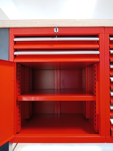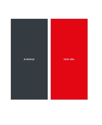 • kolor; korpus antracyt (kolor firmowy), fronty: czerwony-RAL 3020, uchwyty w kolorze aluminium –RAL 9006