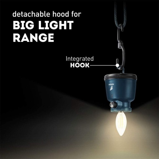 Chcesz powiesić lampę kempingową na belce lub w namiocie? Żaden problem, ponieważ istnieją dwie możliwości zawieszenia. Latarnia w stylu vintage ma rozsuwany pałąk, a na dole wbudowany haczyk. Wskazówka dla fanów bezpośredniego światła: wystarczy odkręcić klosz lampy. Dzięki temu poprawia się wydajność świetlna, dzięki czemu cały namiot.