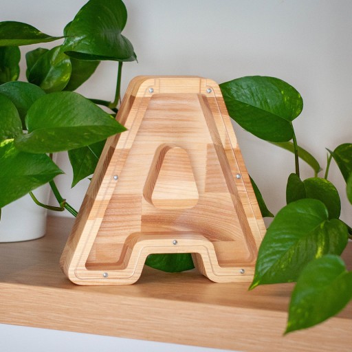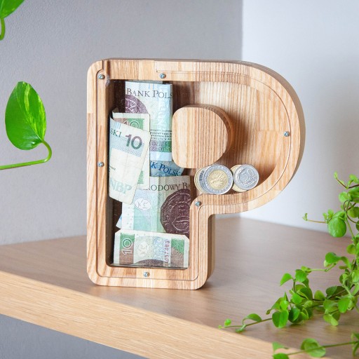 Skarbonka wykonana jest z drewna jesionowego oraz bezpiecznego dla dzieci szkła organicznego.