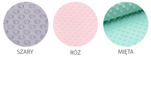 - szmatka sensoryczna, wyposażona w liczne, kolorowe metki i szeleszczące wnętrze. Uszyta z dwóch rodzajów materiału bawełny oraz polaru minky (wzornik poniżej)