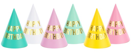 ZESTAW 6 SZTUK CZAPECZEK PAPIEROWYCH Z METALICZNYM NADRUKIEM HAPPY BIRTHDAY.IDEALNA DEKORACJA PODCZAS PRZYJĘCIA Z OKAZJI URODZIN.