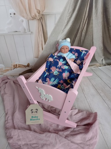 Kołyska została wykonana z drewna świerkowego, solidna i estetyczna. Malowana farbami bezpiecznymi dla dzieci.