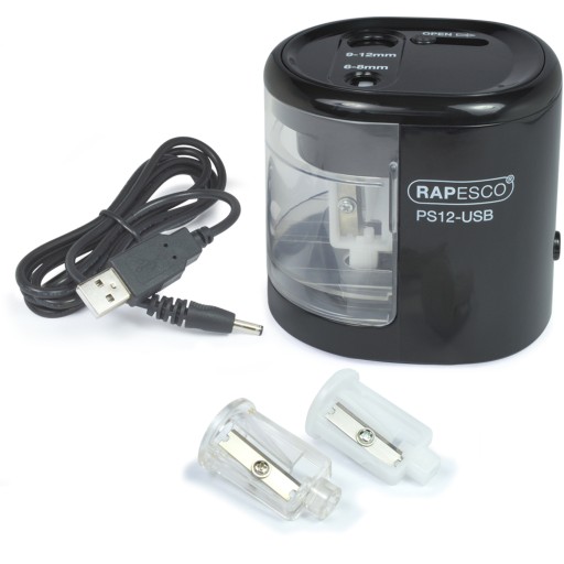 PS12-USB to stylowa, automatyczna temperówka z podwójnym zasilaniem (USB lub baterią), która z łatwością zapewnia szybkie i precyzyjne ostrzenie. Wyposażona w podwójny otwór, dzięki czemu pasują do niej ołówki o średnicach: 6-8 mm i 9-12 mm. Prosta do czyszczenia poprzez usunięcie tacy z wiórami i opróżnienie pojemnika na odpady. Zaprojektowana z funkcją automatycznego wyłączania, która zatrzymuje działanie po zdjęciu osłony, posiada również zabezpieczającą pokrywę na otwór. W zestawie znajdują się 2 wymienne ostrza.