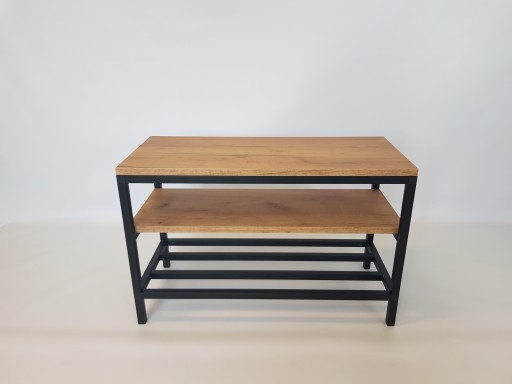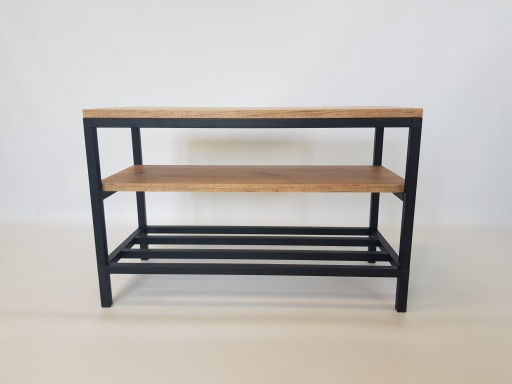 Ławka do przedpokoju z półką na buty. Stelaż ławki wykonany z aluminium anodowanego w kolorze czarnym matowym, siedzisko z płyty meblowej renomowanego producenta.