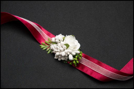 Bukieciki posiadają ozdobną podwójną wstążkę do zawiązania na rękę.