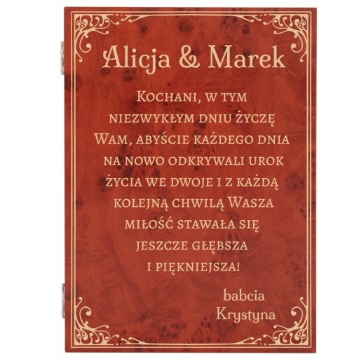 Jeżeli chcesz, aby zestaw akcesoriów do wina stał się również wyjątkową pamiątką, masz możliwość umieszczenia na skrzyneczce swojej osobistej dedykacji np. życzeń, cytatu, grafiki itp. Wykonamy ją techniką grawerunku laserowego, dzięki czemu napis będzie trwały i pięknie odkryje naturalny kolor drewna.