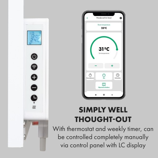 Dzięki termostatowi i zaawansowanym funkcjom, takim jak automatyczne wyłączanie oraz wykrywanie otwartego okna (OpenWindow Detection), promiennik podczerwieni spełni nawet najbardziej wygórowane oczekiwania. Programowalny zegar tygodniowy pozwala nastawić czasy ogrzewania na poszczególne dni tygodnia. Jego superpłaska konstrukcja, szybkie wytwarzanie ciepła i montaż na ścianie oszczędzający miejsce to cechy, które powodują, że Wonderwall Air Art Smart nadaje się zwłaszcza do łazienki. Grzejnik panelowy na podczerwień z klasą ochrony IP44 jest również całkowicie chroniony przed bryzgami wody.