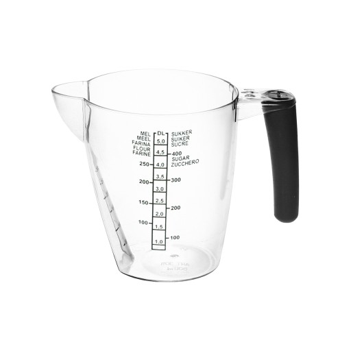 Przezroczysty dzbanek miarowy ma miękki w dotyku uchwyt i skalę ułatwiającą odczyt, która jest nadrukowaną dwustronnie: z przodu i z boku. Ma skalę dla trzech różnych typów produktów podaną w pięciu językach. Pozwala na odmierzanie płynów (w decylitrach) oraz wagi dla cukru i dla mąki. Wygodny uchwyt i bardzo duża wylewka ułatwiają nalewanie. Pojemność do 0,5 l.