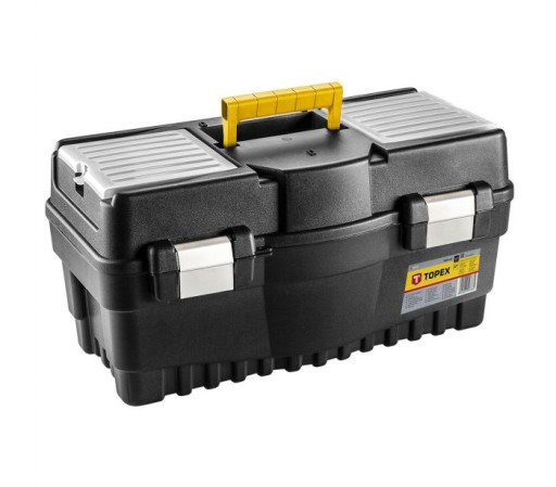 Skrzynka narzędziowa 22" TOPEX (nr ref. 79R133) o wymiarach 54.7 x 27.1 x 27.8 cm. Praktyczna i solidna skrzynka narzędziowa wykonana z wytrzymałego tworzywa sztucznego z aluminiowym zapięciem. Skrzynka posiada 2 organizery do przechowywania drobnych elementów, tackę wewnątrz i wygodny uchwyt do przenoszenia. Pomocne są także boczne uchwyty. Marka TOPEX skierowana jest do majsterkowiczów.
