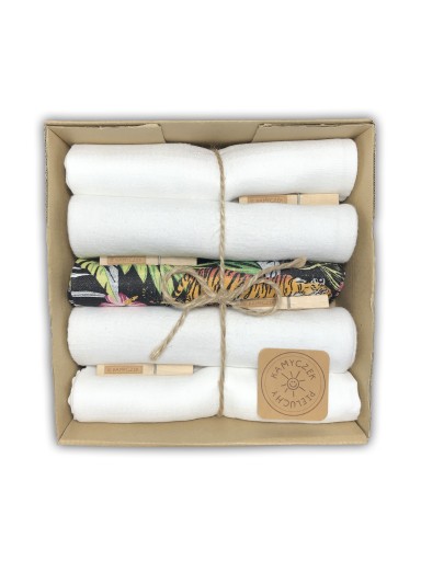 Komplet 5 sztuk najwyższej jakości pieluszek jest efektownie opakowany, gotowy do wręczenia jako prezent. W zestawie znajduje się również gratis w postaci firmowych klamerek.