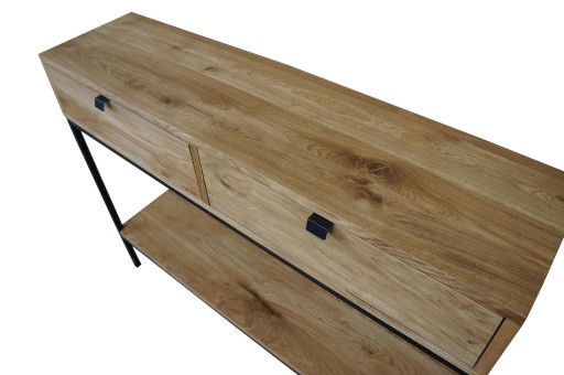 Konsola wykonana z litego dębu. Stelaż wykonany z profili stalowych 15x15mm malowany proszkowo na kolor czarny mat (możliwość pomalowania na dowolny kolor). Stelaż spawany. Bardzo solidny. Drewno olejowane. Konsola posiada otwierane szuflady i półkę.