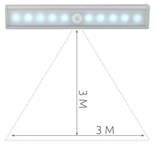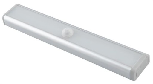 Lampka LED - listwa z wbudowanym czujnikiem ruchu i zmierzchu. Idealnie sprawdzi się do oświetlenia korytarza, łazienki, piwnicy, wnętrza szafy, schodów, półek. Możliwość zamontowania lampki na dołączonej taśmie samoprzylepnej lub na magnesie (wystarczy odwrócić taśmę na drugą stronę i część samoprzylepną przykleić do lampki, a zewnętrzny magnes przyłożyć do metalowej powierzchni, np. na lodówkę, metalowy regał). Lampka po wykryciu ruchu świeci przez ok 15 sekund, po czym automatycznie się wyłącza.