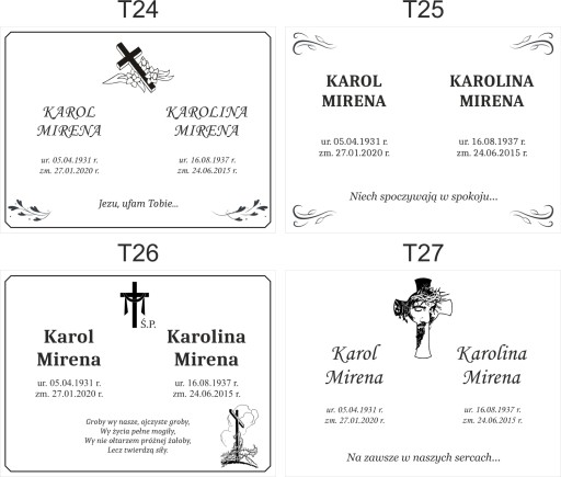 - Ewentualne zmiany w podanym wzorze (czcionka, grafika, cytat, epitafium)